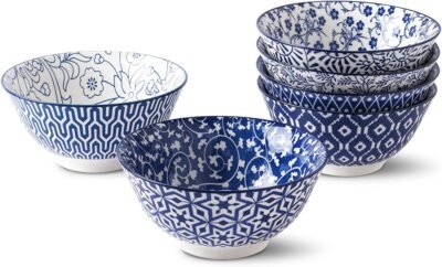 24 oz Cereal Bowls set of 6, Ceramic Soup Bowls for Kitchen, Dishwasher & Microwave Oven Safe- for Cereal, Soup, Pasta, Salad, Blue & White Floral Design Bowl Set